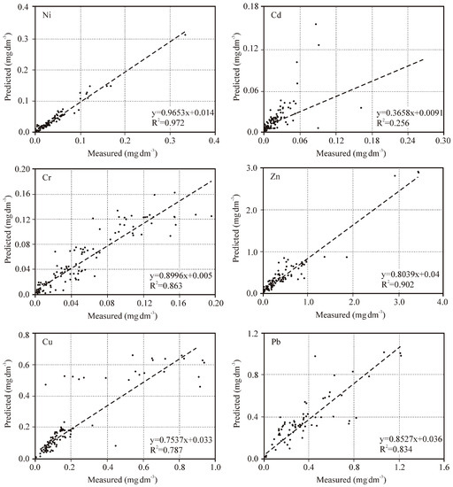 The parameters that characterise the structure of MLP models, namely number of neurons, activation functions in the hidden and output layers, are shown in Table 5. The values of measures of the model fit (R, MAE, RMSE) to experimental data are also given in the table. Based on the data from Table 5, it can be seen that for individual networks, a number of neurons in the hidden layer ranges from 28 to 35. Additionally, the analyses demonstrate that the number of neurons obtained for individual MLP models is not greater than that recommended [25]. The results show that for Ni and Zn, selected independent variables ensure satisfactory predictive capacities of HMC mathematical models—R2 > 0.90 (Figure 5). With regard to Cr and Pb, the fit of simulated values to the measured ones is also satisfactory (0.83 < R2 < 0.86). In addition, Figure 5 shows that the smallest scatter is found for concentrations lower than 0.08 mg∙dm−3 (Cr) and 0.4 mg∙dm−3 (Pb). With respect to Cu, good predictive abilities of the model are observed only up to the value of approx. 0.2 mg∙dm−3. The value of R2 = 0.256 for Cd shows poor fit between ANN predictions and measurements, especially for concentrations higher than 0.03 mg∙dm−3 (Figure 5).