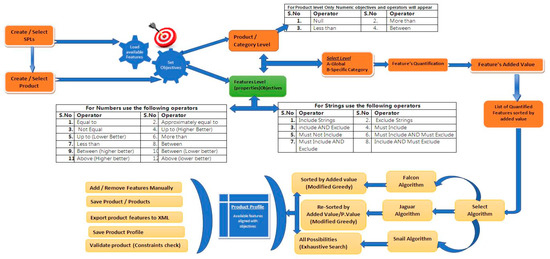 As can be seen in Figure 1, the process of product profile generation starts with the creation of SPL and product/s for that SPL. The user must define objectives at features property level for data quantification. The data quantification uses the operators as shown in the two tables in the diagram for strings and numeric data. The user must set product level objectives, in order for the selection algorithms to produce a product profile. The features quantification, results in added value for the properties based on the importance level set by the user. The list of quantified features is sorted based on added value.