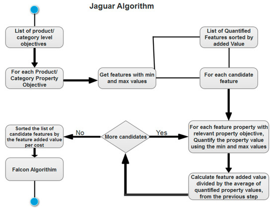 Jaguar works identical to Falcon, but with an extra step at the beginning. Instead of using the list of candidate features sorted by added value, it re-sorts the list based on an Added Value Per Cost (AVPC) metric. The algorithm takes into account the product/category level objectives that require the total property value for the product or category to be “more than” or “less than” a certain value. Every Property Value (PV) of every feature associated with such constraints will be quantified using Equation (5).