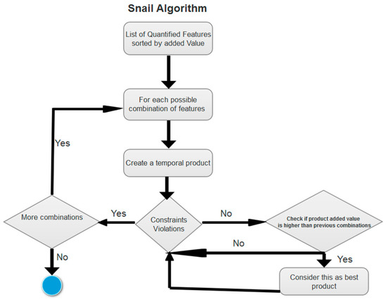 The Snail selection algorithm, shown in Figure 4, is an implementation of exhaustive search. The algorithm will generate all possible products by creating all the combinations of features. After the creation of a product, the algorithm will use a validation function similar Falcon, but it will also check if the minimum number of features per category objective is satisfied. If the product is classified as valid, then its added value will be calculated by adding the added values of all product features. If this added value is higher than the product with the best added value so far, then it will be the new best product. Upon completion of all the combinations, the algorithm will output a product with the highest possible added value.