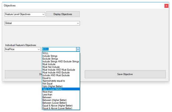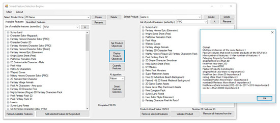 FSE fully supports the methodology proposed in the paper. It starts from the setting of objectives, continue with the quantification of features, manual or automatic features selection algorithm, and finally generates product profile. Figure 5 presents the main window of the application. Users can select, create, delete, or update SLPs and products, display objectives, quantify features, select a selection algorithm, and start the feature selection process. Users can also view the list of available features (at the left) and the features that participate to the product (right). User can manually add or remove features to the product. At the beginning of the feature selection process, the tool will copy any features that the user has selected (if any) and auto-complete the product profile. Figure 6 shows the “objectives” window, from where users can set product/category and feature level objectives. FSE was used for producing the evaluation results presented and discussed in Section 6.