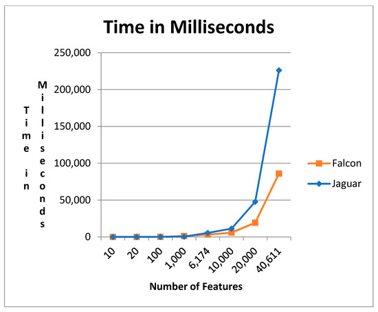 Table 7 is depicted in Figure 7, Figure 8 and Figure 9. In Table 7, the number of features provided in the first column indicates the eight datasets generated for evaluation purposes. In Figure 7, Figure 8 and Figure 9, it could be observed that the performance among the Falcon and Jaguar are close to each other due to presence of limited dataset. The Snail algorithm could be applied only for the first two datasets and thus not shown in the Figure 7, Figure 8 and Figure 9.