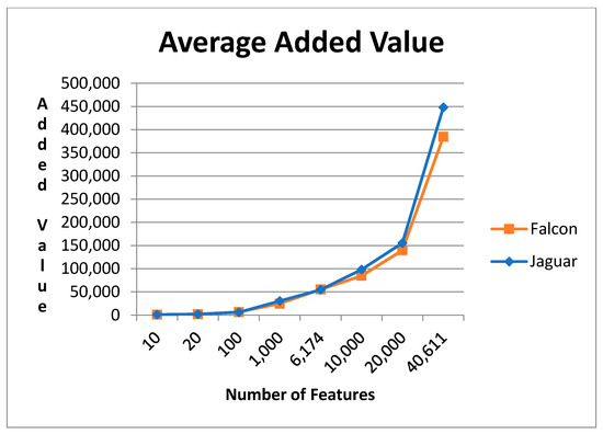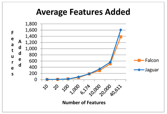 Observation from these figures reveal that Jaguar outperforms Falcon in terms of added value and features added. Meanwhile, Jaguar also consumes slightly higher time when considering the size of the dataset used. Thus, the importance of Jaguar in feature selection is justified, as Jaguar could result in 6% more of added value and 8% of number of features added, in average. In terms of execution time, Jaguar consumed 4% more than that of Falcon, on an average.