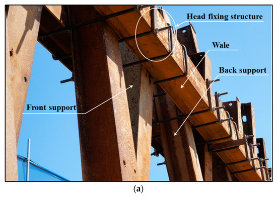 Seo et al. [10] conducted field experiments and a numerical analysis to analyze the restraining effect of the lateral displacement of the back support when IER is utilized for embankment construction. Figure 3 shows the IER utilized during the field embankment experiments. Figure 3a shows the constructed IER structure, whereas Figure 3b shows the final state with the completed backfill embankment. Table 1 summarizes the results of the field experiments on the lateral displacement after completion of the embankment. It was determined that the lateral displacement can be reduced by up to 22% when the back supports are installed, compared to a case without using back supports. In addition, the higher the height is from the bottom of the embankment, the greater the efficiency. Moreover, based on a numerical analysis, the lateral displacement for various cases with a back support was less than that of cases in which the same number of H-piles per unit length was applied to the front wall. As a result, it was confirmed that the lateral displacement can be significantly restrained with the installation of a back support (see Table 2).