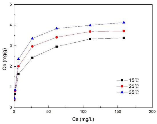 Figure 2 shows the adsorption isotherms of the composite fiber at different temperatures—the equilibrium adsorption capacity Qe of the composite fiber increased with increasing temperature (from 15 to 35 °C) as equilibrium concentration Ce increased. When Ce was low, Qe increased rapidly with the increase of Ce. As Ce continued to increase, the increase of Qe gradually declined, and nearly stopped, which can be explained by the saturation of the composite fiber. The data were fitted by the Langmuir isotherm equation and the Freundlich equation [20]. The calculated parameters are listed in Table 1.