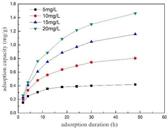 The adsorption rate was fast after the start of adsorption, and gradually became slower with time until the adsorption equilibrium was reached (Figure 4). When the adsorption time was the same, the higher the initial concentration, the larger the adsorbed amount of phosphorus. The initial concentration affected the phosphorus removal performance mainly in two aspects: First, the higher the initial concentration, the denser the phosphorus in the solution, and the easier it was to collide with the surface of the composite fiber to be adsorbed. Second, higher concentration led to greater concentration difference between the liquid film on the surface of the composite fiber and phosphorus. It also increased the driving force for the diffusion of phosphorus to the surface of the composite fiber. It can also be seen from the trend of the curve that the higher the initial concentration, the longer the time required for the adsorption to reach equilibrium. For example, when the initial concentration was 5 mg/L, the composite fiber reached the adsorption equilibrium after 18 h; while when the initial concentration was 20 mg/L, it took more than 48 h. The experimental data were put into pseudo-first-order and pseudo-second-order kinetic equations, and the relevant parameters were obtained (as described in Table 3).