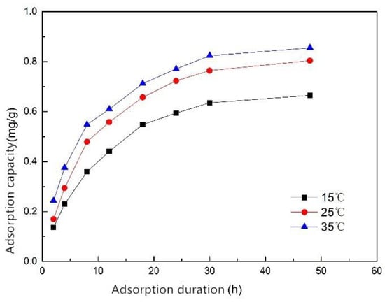 Eight groups of 1 g of ZSFB composite fiber were prepared and placed in 250 mL conical flasks, and 100 mL KH2PO4 solution was added with a concentration of 5 mg/L. The conical flasks were placed in a water bath thermostatic oscillator for adsorption at 25 °C with a speed of 150 r/min. The adsorption time for each group was 2, 4, 8, 12, 18, 24, 30, and 48 h, respectively. Then, the adsorption solution was extracted with a syringe, and the concentration of phosphorus was measured by the ammonium molybdate spectrophotometric method. The phosphorus adsorption capacity of the composite fiber was calculated, and the adsorption kinetic curve was drawn based on the results. The experiments were also conducted with the same method at 15 and 35 °C, and conducted with a different initial phosphorus concentration (10, 15 and 20 mg/L) at each temperature.