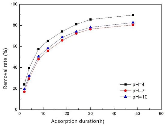 The phosphorus removal performance was best when the pH level was 4 with a removal efficiency of 90%, and the phosphorus removal performance at pH 10 was slightly better than that at pH 7 (Figure 6). Therefore, we can conclude that in the range of pH 4 to 10, the acidic condition is beneficial to improve the phosphorus removal performance of the composite fiber, and the alkaline condition has little effect on that. This is because under acidic conditions, the composite fiber releases more metal ions, such as Fe3+ and Ca2+, which combine with the phosphate to form precipitates, and the phosphorus is removed. Under alkaline conditions, although the release of metal ions is inhibited, Fe3+ combined with the modified adsorption substrates easily forms Fe(OH)3 flocculant on the surface of the fiber, which is beneficial to the adsorption and precipitation of phosphate. Moreover, the activity of the alkali-activated adsorption substrates will be improved, so the overall performance of the composite fiber is slightly improved under alkaline conditions [25]. Therefore, compared with the neutral condition, the acidic or alkaline conditions (4 ≤ pH ≤ 10) did not reduce the phosphorus removal effect of the composite fiber. It can be seen that the composite fiber performed well under both acidic and alkaline conditions.