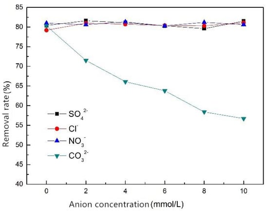 The effects of SO42−, Cl−, NO3− and CO32− on the phosphorus removal efficiency of ZSFB composite fiber were studied (Figure 8). The figure indicates that SO42−, Cl− and NO3− had little effect on the phosphorus removal in the concentration range of 0~10 mmol/L. However, CO32− had an inhibitory effect on the phosphorus removal. The higher the CO32− concentration, the lower the removal rate of phosphorus. The reason is that Ca2+ can also combine with CO32− to form CaCO3 precipitate, which will compete with the phosphate and cause the removal rate to reduce.