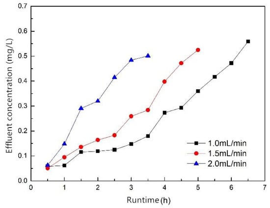 Figure 9 shows the breakthrough curves for different influent flow rates of 1.0, 1.5 and 2.0 mL/min; the filler mass was 30 g, the influent concentration was 10 mg/L and the effluent phosphorus concentration was 0.5 mg when breakthrough occurred. The results show that the influent flow had a great influence on the time of breakthrough, and as the influent flow increased, the time of breakthrough decreased. When the influent flow rate was 1.0, 1.5 and 2.0 mL/min, the time of breakthrough was 6.5, 5 and 3.5 h, respectively, and the treated water volume was 390, 450 and 420 mL, respectively. To sum up, excessive or too small influent flow was not conducive to phosphorus removal. The optimum influent flow rate was 1.5 mL/min, at which most water is treated. This was because when the flow rate was too large, the hydraulic retention time was short, and the phosphorus was insufficiently contacted with the composite fiber, so the amount of treated water was reduced. Moreover, the larger the flow rate, the higher the total amount of water treated at the same time, and the shorter the time of breakthrough. However, when the flow rate was too small, the flow rate in the adsorption column was too slow, and it seemed that the wastewater in the column diffused and mixed in the longitudinal direction, which was unfavorable for adsorption and resulted in a decrease in the amount of treated water [39]. Therefore, it is reasonable to control the influent flow rate at 1.5 mL/min, and this flow rate was also used in subsequent tests.