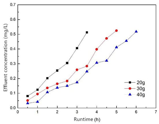 Figure 10 shows the breakthrough curves when the filler masses were 20, 30 and 40 g; the influent flow rate was 1.5 mL/min, the influent concentration was 10 mg/L and the effluent phosphorus concentration was 0.5 mg/L when breakthrough occurred. The results show that the filler mass had a great influence on the time of breakthrough. As the filler mass increased, the time of breakthrough was also prolonged, and the effluent phosphorus concentration also decreased with the same runtime. The time of breakthrough of the fillers of 20, 30 and 40 g were 3.5, 5 and 6 h, respectively, and the treated water volumes were 315, 450 and 540 mL, respectively. The results indicate that increasing the filler mass facilitated the removal of phosphorus. The reason was that adsorption mass increased as filler mass increased, which led to an increase of treated water. According to the effect of the dosage on the phosphorus removal performance (Section 3.1.3), the larger the dosage, the higher the phosphorus removal rate. This is consistent with the conclusion that the effluent phosphorus concentration decreases as the filler mass increases.
