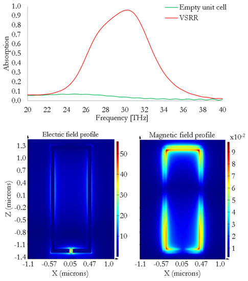 The absorption peak () is located at 30.21 THz, and demonstrates a full-width at half-maximum (FWHM) of 6.96 THz. Figure 2 (bottom) shows the electric and magnetic field profiles (magnitudes) at the peak absorption frequency. The large absorption peak is being driven by the fundamental resonance of the VSRR, as indicated by the electric and magnetic field plots. The spectral absorption profile of the geometry is heavily dependent on the parameters illustrated in Figure 1. Many of these dependencies were explored as a part of this study but, for brevity, are not included here.