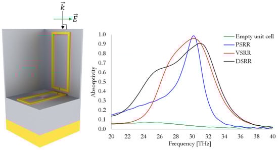 In a unit cell containing dual split-ring resonators (DSRR), the resonator gaps are, at first, intentionally placed near each other to strengthen intra-cell coupling. This condition is further ensured by the matching spectral locations of the peak absorption for the individual resonators. In the DSRR unit cell, the geometric dimensions of the unit cell, VSRR, and PSRR remain the same as in the previous geometries. The unit cell geometry, as well as the plot of spectral absorption for all geometries, are illustrated in Figure 4.