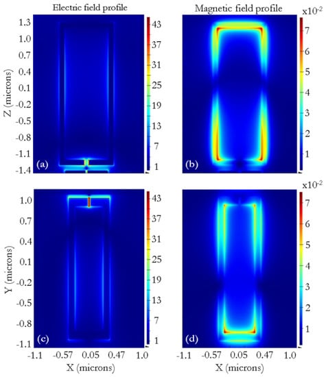 Similar to previous cases, electric and magnetic field profiles are shown in Figure 5. Specifically, Figure 5a,b shows the electric and magnetic field profile for the VSRR (similar to those shown in Figure 2), and Figure 5c,d shows the electric and magnetic field profile for the PSRR (similar to those shown in Figure 3). At peak absorption, the field profiles appear similar to those in the single SRR cases. When compared to the single SRR geometries, however, a significant decrease in peak field amplitude can be seen for both resonators. Additionally, the field profile near the point of highest concentration is noticeably altered due to the presence of the other resonator, further demonstrating the intra-cell coupling between them.