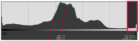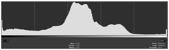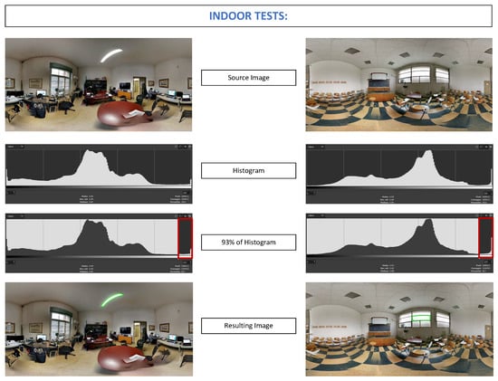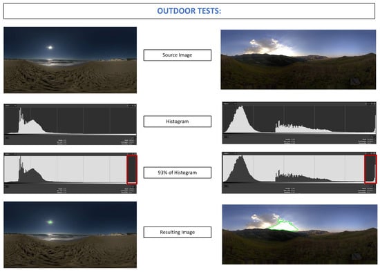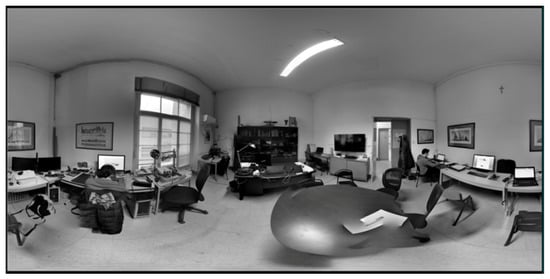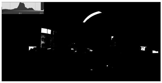 OpenCV computer vision library is necessary for the image processing pipeline. Since it was written in C++, the program for the recovery of the light source position was first developed and tested in a standalone mode and then integrated as a dynamic-link library (.dll) into Unity. It was chosen to create a specific .dll instead of using a wrapper, such as “Emgu CV” or “OpenCV for Unity” because they are not free for Unity. Moreover, our purpose was to create a standalone package including only the necessary functions and referring to the major installation of OpenCV on the computer, hence the multi-platform capability of adding OpenCV to a specific path of the system. The light detection routine applies a sequence of filters, thresholds and algorithms. Firstly, the 360 degree spherical image is converted from RGB to B/W, since the final scope is to recognize light sources that tend to be white and to have a high level of brightness (Figure 4). Moreover, the conversion of the 360-degree spherical image from RGB to B/W makes it easier to apply a threshold value to the pixels color values since they vary only from 0 to 255. After the greyscale conversion, it is possible to apply a threshold value to the image in order to delete all the pixels with color value below the given threshold. This threshold is chosen by analyzing the image histogram (Figure 5). In the first step, the maximum value of pixels was found. It is important to notice that not every photography covers the entire range of 0–255 such as too dark or too bright images. After the definition of the spectrum, it was possible to calculate the average value of pixels. The imposition we made was the definition of the ratio of these two values: