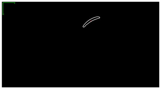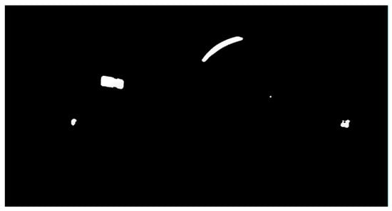 Using the OpenCV function “cv::findContours”, it was possible to identify the contours of the different light sources. After that, the function “cv::moments” was used to calculate the moments of the surrounded light sources. From these moments, useful data such as area and centroid could be extracted. For this reason, the implementation of the function “cv::moments” was preferred to the function “cv::contuorArea”, which provides less information. Finally, the contour and the COG of the greatest area was positioned with respect to the reference system (Figure 10). For this example, we decided to delete all the areas except for the greatest one corresponding to the chandelier.