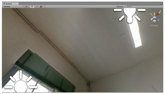 There are two shadows because the procedure was reiterated several times allowing to find more than one light source. Inside the algorithm, it is possible to increase the iteration step allowing ARPAS to also identify minor light areas. This is important in indoor environment when both sunlight and artificial light are present. Figure 23 shows that the applied method correctly found both artificial light and sunlight, providing the right position of the source lights in Unity environment.