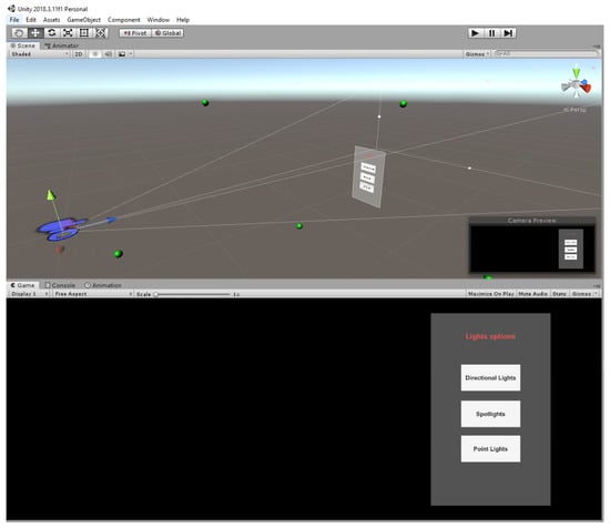 The image width corresponds to a 360 degree rotation around Unity y-axis, while the image height corresponds to 180 degree around Unity x-axis. The application of this algorithm to a real environment in Unity Editor gives effective results. Figure 13 shows that virtual lights are positioned precisely where real light sources are located, both natural light provided in this example from the sun through the window and artificial light from the chandelier. Thanks to a proper User Interface (UI), the user can select the self-positioned lights and define them as directional lights, spotlights or point lights. The user can now select a light source identified and posed by the algorithm and he can set the light source as directional, point light or spotlight (Figure 14). The distance from the HoloLensCamera, hence the user distance from the real light, is set manually by the user after selecting point lights and spotlights, and only for these two types of lights.