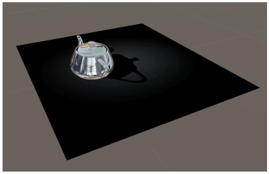 The method presents few shortcomings: the first one is related to the alpha channel in OST HMDs, such as HoloLens; the second one is related to the arbitrary choice of listing the detected light sources; and the third one refers to the projection of shadows under non-planar surfaces. Regarding the alpha channel, a meticulous calibration of the RGB values of the plane into which SD draws the shadow is required. These RGB values should be as near as possible to RGB = (0,0,0), because in the real world shadow is black, and, at the same time, they should be slightly higher than RGB = (0,0,0), for example RGB = (10,10,10), to create the illusion of negative shadow. If the chosen value were too high, the illusion would fade away because the plane with the SD shader would appear glowing and translucent. This is why underneath plane should be as white as possible; however, our SD works even with grey surfaces such as in Figure 25 and Figure 26. Regarding the listing of light sources by importance, as declared in Table 1, the intensity was set arbitrarily. This step should be ameliorated and improved, but the main focus of the work was to identify the light source into and HDR and to pose real-time virtual light source in the scene, such as directional lights and point lights. Area lights need to be baked into Unity; hence, they cannot be suitable for real-time applications. The second objective of the work was to enable the visualization of shadows onto a OST HMD. The problem of projecting shadows onto non-planar surfaces occurs because of the floor object. The floor object is defined planar (Figure 27 and Figure 28). The shadow on real surface appears as a projection of the shadow caught by the floor object through its normal direction. The distortion cannot be produced.