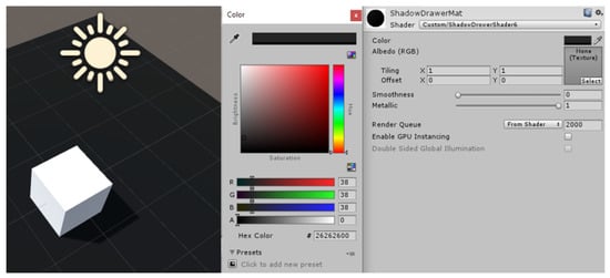 A separated treatment must be done on the representation of the shadows obtained with the method previously described. It is worth noting that, using HoloLens, the visualization of objects shadows is far from immediate and simple. In fact, the alpha channel in the lights combiners, the technology behind HoloLens, is the black color. In this way, the darker and more marked is a shadow is dark, the less it will be visible to the user, until the paradox whereby a shadow, or an object, completely black, will be invisible to the observer. This is also deducible from the fact that a completely black Skybox is set in the Unity editor to use HoloLens: thus, the device projects only the objects on the scene, deleting the background because it is black and therefore transparent [13]. Thus, the black color cannot be used with HoloLens. At this point, the difficulty of visualizing the shadow of an object is evident, since shadows are black. Here, the idea of a negative Shadow Drawing (SD) shader and ad hoc shader was created with the use of CG programming language (Figure 15).