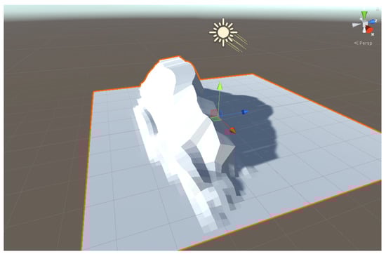 As shown in Figure 2, the algorithm discovered as light sources the lamp and the window, which was softer compared to the first one. The application can detect up to three light sources. The determination of light intensity is semi-manual based on Table 1 due to the simplicity of the implementation and because the light intensity overcame the original purpose of this study. The second result is the implementation of ARPAS in HoloLens. This step was achieved using the SD shader. Figure 24 shows that the negative shadow visual effect gives the expected result, also with more complex geometries (Figure 25 and Figure 26).