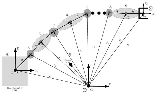 The 2D representation of a space robotic system is outlined in Figure 1, where the system consists of bodies . denotes the base spacecraft, usually called base, and denotes the ith rigid link. The bodies are connected by n revolute joints and each joint provides the system with a single DOF (degree of freedom). Additional symbols in Figure 1 are explained as follows: