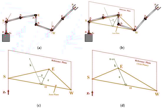 The inverse kinematics of redundant space robotics are complex, since one point in the task space corresponds to infinite points in the joint space. An approach based on the geometric construction of the robot, especially the robot called Spherical Revolute Spherical (SRS) [,,,], is well developed. Each component of the joint configuration is formulated as a function of the arm angle. By assigning a value to the arm angle, a finite number of joint configurations are obtained. Figure 2 presents the process for constructing the arm angle. The following legend is useful to understand the different subfigures. Figure 2a outlines the 7-DOF rotational robot SRS based on the D-H approach, together with the three main points S, E, and W. The shoulder point S denotes the intersection point of -axis (), the elbow point E denotes the origin of , and the wrist point W denotes the intersection point of -axis (). Figure 2b outlines the reference plane constructed by -axis and , the arm plane , and the arm angle from the reference plane to the arm plane. Figure 2c coincides with Figure 2b, where denotes the vector from S to W. k and e denotes the vectors perpendicular to in the reference plane and the arm plane, respectively. Figure 2d outlines a case , meaning that the reference plane coincides with the arm plane. The following procedure is carried out for the derivation of the joint configuration .