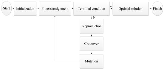 The basic GA [,], inspired by natural selection, is a heuristic optimization algorithm with global search abilities. A certain number of individuals, usually called initial solutions, are randomly generated and contribute to the globality of the search space. During evolution, each individual, corresponding to a chromosome, is evolved toward the best position in the whole search space. Furthermore, chromosomes are updated according to fundamental genetic operators, including reproduction, crossover, and mutation. The reproduction generator contributes to the replication of chromosomes with better fitness values from parents to offspring. Crossover and mutation generators contribute to generating new chromosomes. On the basis of a crossover generator, the paired chromosomes exchange part of their genes with each other. On the basis of the mutation generator, one or several genes of a chromosome are updated. The flowchart of basic GA is shown in Figure 3.