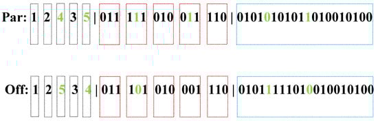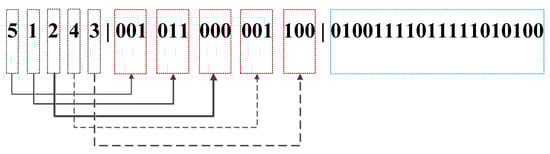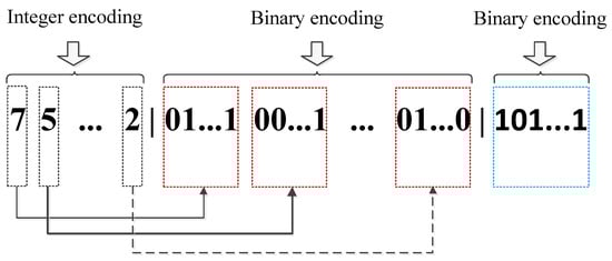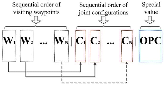 The encoding mechanism is essential, and the theoretical principle of IGA is implemented based on it. Traditional encoding mechanisms include the binary, the floating, the integer, and the symbol. The binary mechanism provides convenient encoding and decoding operations when solving discrete or continuous optimization problems. The floating mechanism provides results with high precision when solving continuous optimization problems with multidimensional functions. The integer mechanism is usually employed for solving combinatorial optimization problems such as the Traveling Salesman Problem []. The symbol mechanism contributes to the combination of GA and other algorithms. In IGA, the integer encoding mechanism is employed for the waypoint sequence, while the binary encoding mechanism is employed for the sequence of joint configurations and the special value corresponding with the cubic coefficients of the arguments, which is sketched in Figure 5.