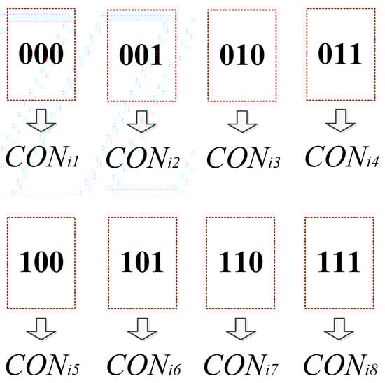 The second part of each chromosome denotes the sequence of joint configurations corresponding to the first part of the chromosome, where binary encoding is implemented. Since eight special joint configurations corresponding to one waypoint are considered, each joint configuration is coded by one byte of three bits. Figure 6 represents the eight categories of bytes, where , also shown in Equation (20), and it denotes the mth joint configuration corresponding to the ith waypoint.