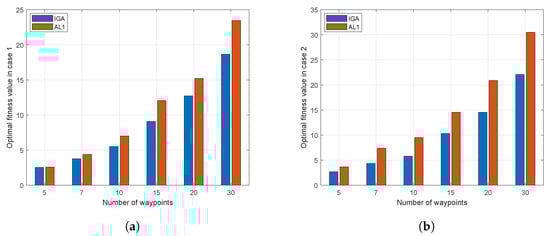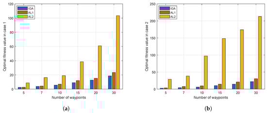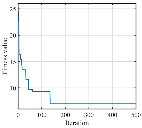 In this case, the MTTP for FFSR2 is studied. Figure 15 represents the variation trends of the fitness values using IGA, where the minimum maneuver time of FFSR2 is s, and the module value of the base attitude in Equation (8) is deg. FFSR2 movements are represented in Figure 16, where the red parts in each subfigure denote the values at the corresponding waypoints. The legend of Figure 16 is explained as follows: Figure 16a,b represents the time histories of the position and the attitude of the end effector, respectively; Figure 16c represents the time histories of the base attitude; Figure 16d,e represents the time histories of the seven joint angles; Figure 16f,g represents the time histories of the seven joint angular velocities. Figure 16a,b shows that the optimal waypoint sequence is , and all waypoints are accurately visited. It can be seen that the optimal waypoint sequence in this case is different from that obtained in Case 1, since one more objective function was considered in this case. Moreover, the randomness of IGA is a main factor. In Figure 16c, the variation amplitude of each Euler angle is less than 0.3 deg during the whole movement of FFSR2. Figure 16d,e shows that the joints move smoothly, while Figure 16f,g shows that the joint angular velocities at each waypoint are zero. Furthermore, Figure 16d–g shows that the joint angles and joint angular velocities are within the predefined region.