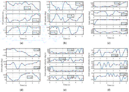 In this case, the MTTP for FFSR1 is studied. Figure 13 represents the variation trends of fitness values using IGA, showing that the minimum maneuver time of FFSR1 is 5.196 s. Figure 14 represents the movements of FFSR1, where the red points in each subfigure denote the corresponding values at the waypoints. The following explanation is useful to understand the subfigures: Figure 14a,b represents the time histories of the position and attitude of the end effector, respectively; Figure 14c,d represents the time histories of the seven joint angles; Figure 14e,f represents the time histories of the seven joint angular velocities. Figure 14a,b shows that the optimal waypoint sequence is , and all waypoints are accurately visited. Figure 14c,d shows that the joints move smoothly, while Figure 14e,f shows that the joint angular velocities at each waypoint are zero. Moreover, Figure 14c–f shows that the joint angles and the joint angular velocities are within the predefined region. In Figure 14, each joint angle denotes one component of the joint configuration , and each joint angular velocity denotes the 1st derivative of .