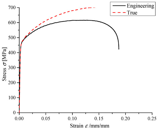The monotonic tensile test was conducted on this specimen under velocity control at the rate of 0.025 mm/s. The gauge length of the extensometer used for measuring the strain was 12.5 mm. Figure 5 shows both the engineering and true stress/strain curve. Afterwards, the Young modulus , tensile strength , and yield strength could be obtained from this figure, and Table 3 lists their values.