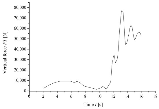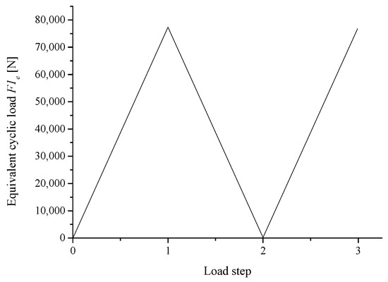 In order to determine the loads at connection sites of the welded A-type frame, the coupled rigid and flexible multi-bodies dynamic model for the whole electric wheel dump truck was constructed utilizing ADAMS software, as shown in Figure 7. The accuracy of this model was verified by the experimental data that was illustrated in previous work [25]. Subsequently, the load information at different connection sites could be obtained from the simulation under conditions of downhill and turning braking with full load at the speed of 20 km/h, as shown in Figure 8. The load time history at the very beginning of simulation from 0 s to 2 s was ignored, because the simulated results in this stage were not stable enough. This load was transformed to be loading and unloading and reloading condition to simulate the mechanical behavior under cyclic loading, as shown in Figure 9.