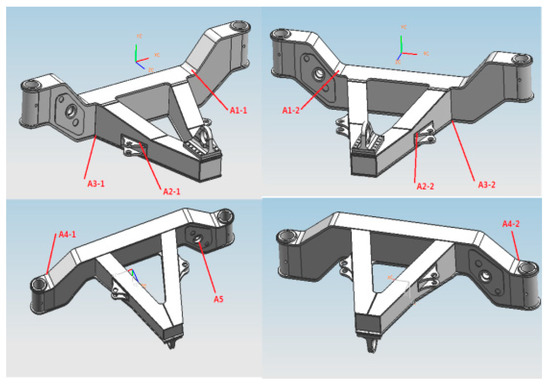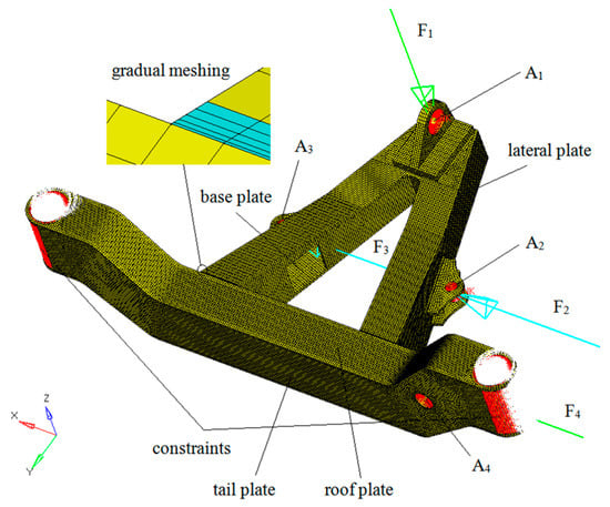 The finite element model of the welded A-type frame was built by software HYPERMESH, as shown in Figure 10. There were 84,948 elements and 134,564 nodes, which included 82,046 C3D8 elements and 2902 C3D6 elements. Gradual meshing simulated the weld metal was simulated. The connection sites in the welded A-type frame were marked in Figure 10 by A1 (front traction joint), A2 (right steering joint), A3 (left steering joint), and A4 (front lateral stabilizer joint), and the corresponding loads at fours joints were , , , and . There were four kinds of plates marked by lateral plate, based plate, roof plate, and tail plate, whose thickness was different from each other. Subsequently, in order to testify the accuracy of this model, the quasi-static analysis for simulating the mechanical behavior under the condition of random horizontal road running with full load was conducted to compare the calculated equivalent stresses with the tested ones. Figure 11 shows the simulated stress contour. The maximum stress located at the corner between the bottom roof plate and right lateral plate was 83.69 MPa, which was caused by the stress concentration at geometric transition position. The measuring points of welded A-type frame are displayed in Figure 12, and the layout of strain gauge at point A1-2 are also shown in Figure 13. Table 4 lists the experimental data for the same condition obtained from the mine road tests. The relative errors between the simulated results and the tested ones were around 10%, except the measuring point A2-1 and A2-2. Ignoring the steering loads at location A2 and A3 under the condition of random horizontal road running with full load in the simulation caused it. However, there were some loads at these two joints in the real truck due to goods partiality and residual pressure in steering power cylinder.