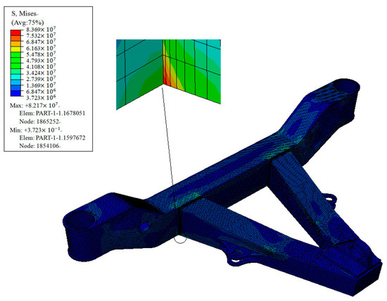 Subsequently, based on the optimized results that are mentioned above, the fuzzy fatigue reliability of welded A-type frame was again evaluated by MATLAB software. It rose up to 95.12%, and thus met the engineering requirement. The stress contour of optimized A-type frame under the same condition is shown in Figure 20. The maximum equivalent stress was located at the same place, but the value dropped to 107.81 MPa and the optimized A-type frame presents more uniform stress distribution.