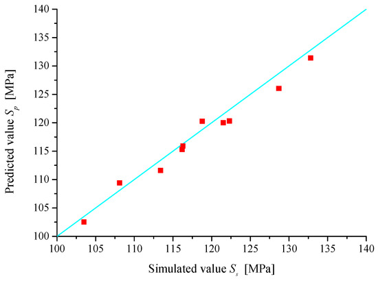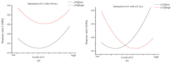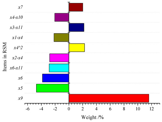 According to the approximate model that is mentioned above, the sensitivity of items in response surface model was analyzed. The influence level of items on the maximum equivalent stress was different and only 10 of them are listed in Figure 14. It could be seen in the Pareto chart that the item was the most sensitive to the subject, and its impact was positively correlated and was close to 12%. The items , , and also had positive influence and all were close to 2%. The remaining items had negative correlation, while the value of the items and were both close to minus 4%.