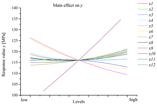 Subsequently, the main effect chart between all random variables and the out variable is shown in Figure 15. The item had the maximum slope, which meant that the vertical force at front traction joint had the most influence on the maximum equivalent stress . This conclusion is the same as the result from the Pareto chart. The item had the negative slope, which meant that the increase of thickness of tail plate could lessen the maximum equivalent stress . In addition, the interaction effect between items and , and the items and , are also shown in Figure 16. It could be seen that there is no intersection between Young Modulus and lateral force at right steering joint , which meant that they had no relevance. In contrast, there is relevance between Young Modulus and lateral force at the front lateral stabilizer joint .