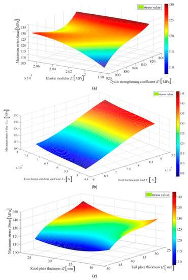 Another 10 samples of random variables were picked out, and their corresponding stress values were separately calculated through the approximation model and the finite element analysis, in order to verify the accuracy of the response surface model Equation (14). Afterwards, the simulated results from finite element analysis and the predicted results from the Equation (14) were compared, as shown in Figure 17. It could be seen that they are close to each other, which meant that the accuracy of the response surface model Equation (14) was pretty good. To observe the relationship between the maximum equivalent stress and the random variables, the three-dimensional graph of response surface model is displayed in Figure 18. Figure 18a shows that there is an obvious nonlinear relationship between the maximum equivalent stress and Young Modulus and cyclic strength coefficient , while it could be seen in Figure 18b that there is linear relationship between maximum equivalent stress and vertical force at front traction joint and lateral force at front lateral stabilizer joint . Figure 18c shows that there is local linear relationship and nonlinear relationship between the maximum equivalent stress and thickness of roof plate and thickness of tail plate .