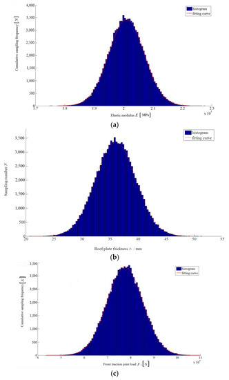Before the estimation of fuzzy fatigue reliability of welded A-type frame started, randomness of Young Modulus , thickness of roof plate , and vertical force at front traction joint are shown in Figure 19 by one million times sampling. The random sampling results showed that they all appeared with normal distribution. Finally, according to Equations (10)–(14), the fuzzy fatigue reliability of welded A-type frame under conditions of downhill and turning braking with full load was acquired by programming in MATLAB software. Afterwards, it was found that the fuzzy fatigue reliability was only 69.47% under this severe case, which was far less than the engineering requirement. Therefore, the optimal design for improving the fuzzy fatigue reliability was needed.