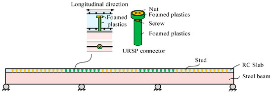The other approach employed to reduce tensile stress and control cracking in concrete is releasing the composite effects by adopting a new type of connector named the uplift-restricted and slip-permitted (URSP) connector instead of the traditional shear connectors [27,28,29,30,31], as illustrated in Figure 1. The traditional shear connectors are mainly the headed stud connector and the Perfobond strip [32,33]. To provide an alternative to replace the stud connector in special situation, an innovative connector named the truss-type shear connector has been proposed and received much attention recently, and has been proven to reduce the production cost and improve the resistance value [34]. However, to reduce the tensile stress and control the cracking in slabs in negative moments, a new type of connector in this paper is designed to partially release the slip constraints along the longitudinal direction while retaining the uplift resistance of the steel-concrete interface. To achieve the structural functions of connectors, foamed plastics are wrapped around the screw and nut. In this way, the slip between steel and concrete is partially allowed. Several theoretical and experimental studies on the performance of URSP connectors have been conducted. The slip and uplift performance has been investigated and a shear force-slip hysteresis model has been proposed based on the push-out tests [27]. In addition, an optimization analysis of URSP connectors in composite bridges and some practical design guidelines, as well as construction methods, have been provided by Li et al. [31]. However, theoretical and experimental studies on the practical application of this new type of connector in a composite frame system for building structures are still insufficient, and the influence of the URSP connector on the strength, stiffness and cracking performance of composite frame structures remains a research blank in this field.