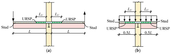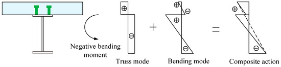 The shear force at the steel-concrete interface in composite beams generates slip and induces additional deflections. A stress and strain analysis considering the interface slip behavior of the composite beam is depicted in Figure 2. When a composite beam section is subjected to a negative bending moment, the stress and strain generated on the section can be divided into two parts: truss mode and bending mode [35]. In the truss mode, the shear force at the steel-concrete interface provided by shear studs is considered. Therefore, the concrete and steel are subjected to axial tensile and compressive loads, respectively. While in the bending mode, the bending moments of the concrete slab and steel beam are considered, and the two components behave as two independent beam elements with individual neutral axes. It has been demonstrated that the contribution of the truss action is proportional to the degree of shear connection [36]. For composite beams using URSP connectors in regions of a negative moment, the longitudinal constraint along the span direction at the steel-concrete interface is released. Therefore, the truss mode can be neglected, and only the bending mode is taken into consideration. Since the flexural modulus of the concrete slab is much smaller than that of composite components, the tensile strain and stress of the concrete slab can be sharply decreased in beams under negative bending [37].