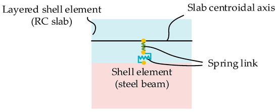 To consider the interfacial slip between the RC slab and steel beam, shear connectors are simulated by springs along the longitudinal direction. Meanwhile, the uplift action is simulated by springs along the vertical direction as per the numerical simulation performed by Stitic, A. et al. [42]. As shown in Figure 5, to simulate each shear connector, the node on the shell element of the RC slab is connected to the corresponding node on the shell element of the top flange of the steel beam by two springs including one vertical spring and one longitudinal spring. In this paper, the springs along the vertical and longitudinal direction are independent.