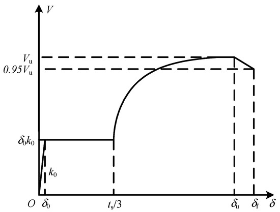 At the beginning of the curve, the initial stiffness k0 represents the bond stiffness between the concrete slab and the steel beam. After a small slip δ0, the natural bonding surface fails, and the foamed plastic is pressed. Due to the small stiffness of foamed plastics, the stiffness in this stage is regarded as 0. When the slip δ reaches ts/3, the screw will be under shearing stress and the shear capacity Vu is also identical to that of the traditional headed stud. Lastly, when δ is larger than δu, the shear force descends and fracture occurs on the connector. For the URSP connectors, the key factors are determined by referring to the experimental findings of Han [45], namely, k0 = 3.75 kN/mm, δ0 = 0.15 mm, and ts = 5 mm.