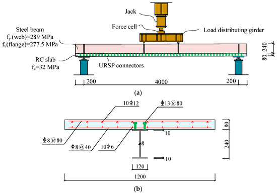 In order to validate the proposed finite element modeling approach for a URSP connector, an FEM-based verification test on a simply supported beam with URSP connectors along the entire span subjected to negative bending moment is performed in this section [45], since there has been no experiment on the structural performance of the composite frames with URSP connectors till now. The loading scheme, cross-section, URSP connector, and material information of the tested beam are depicted in Figure 8a–c. The numerical results are compared with the test results, as shown in Figure 8d. It can be seen that the predicted bending moment-deflection curve at the midspan is consistent with the experimental results presented in reference [45], which verifies the accuracy of the FE modeling methods in this study.