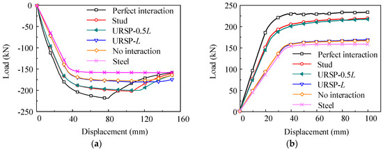 As illustrated in Figure 3, LU is the length of regions where URSP connectors are placed along the beam. Load-displacement results at the beam end depicted in Figure 9 are the results corresponding to the side joint with different LUs and three extreme cases including the perfect interaction (nodes of the RC slab and steel beam are shared with each other), no interaction (the longitudinal stiffness of shear connectors at the interface is zero) and the bare steel beam (without an RC slab). It can be seen from Figure 9 that the ultimate resistances of the joint with perfect interaction are 8.7% and 7.7% larger than that with all studs (LU = 0) when subjected to a hogging and sagging moment, respectively. For the overall stiffness, the increases are 10.7% and 23%, respectively, which is consistent with the results presented in an earlier study [50]. Compared to the result with all studs (LU = 0), the differences corresponding to LU ranging from 0.2L to 0.9L are very small and can be neglected under a hogging and sagging moment. For simplicity, only the numerical result while LU is equal to 0.5L is plotted in the figures. However, compared to the result with all studs (LU = 0), the ultimate resistances with LU = L decrease by 10.9% and 23.3% under a hogging and sagging moment, respectively, and for overall stiffness, the decreases are up to 23.0% and 38.7%. Moreover, it can be observed that the curve with LU = L is very close to the results with no interaction, which demonstrates that the interfacial shear force can be effectively released by applying URSP connectors along the whole beam. Nevertheless, due to the contribution of the RC slab, the ultimate capacities corresponding to the hogging and sagging moment while the LU = L are 13.7% and 6.6% higher than those of the bare steel beam. Meanwhile, the increment ratios of structural stiffness are 9.3% and 7.5%, respectively. In addition, it can be observed that obvious buckling of the bottom flange of the steel beam occurs under the hogging moment with a high strain level, resulting in a rapid reduction of the load-bearing capacity of beams with perfect interaction and all studs, as presented in Figure 9a. The occurrence of buckling can be effectively postponed due to the application of URSP connectors, which increases the ductility of the beam hinge and the whole frame structures under seismic loads.