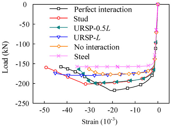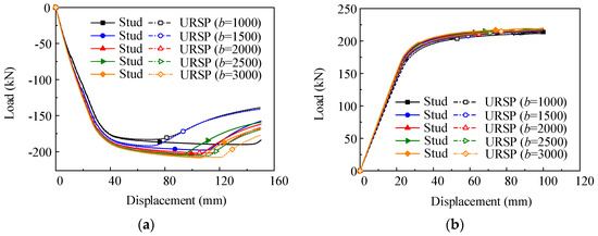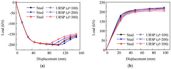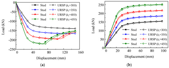 Based on the simulation results above, it can be concluded that if the URSP connector’s length LU is less than L, small differences are observed among the load-displacement curves with different LUs. Therefore, only the model with a URSP arrangement length equal to 0.5L (denoted as URSP) is chosen to be compared with the model constructed with all studs (denoted as Stud) in the following parameter analysis for simplicity.