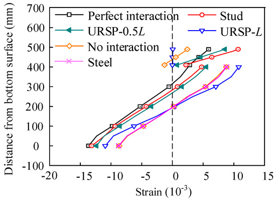 For different beams, the strain distributions along the section height of the composite beam at the drift ratio of 1/50 (corresponding to the ultimate limit state) are shown in Figure 11. This figure shows that interface slip exists in the beam with all studs of a full shear connection degree. Moreover, the slip increases and the height of neutral axes in the steel girder decreases while using the URSP connectors. When LU = L, or no interaction between the concrete slab and steel girder exists, the two parts behave independently and the strain profile of the steel girder is similar to that of the bare steel beam. Since the truss action is proportional to the degree of shear connection as is mentioned above, compared with no interaction and without arranging the URSP connectors, the tensile strain at the slab top with studs is obviously larger.