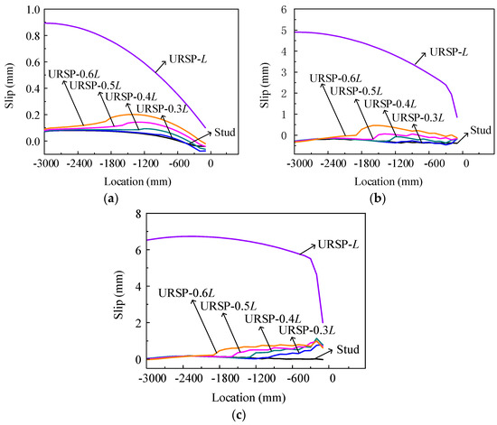 Since the interface slip between the RC slab and steel beam always leads to a reduction of the overall structural stiffness [44,51,52], a detailed analysis of the slip effect under different cases is performed to interpret the results presented in Figure 9. The slip distributions along the beams under the hogging moment corresponding to the loading displacement (denoted as u in the following sections) of 10 mm, 70 mm and 150 mm, which represent the elastic state, ultimate state and maximum displacement state, respectively, are summarized in Figure 12a–c. The origin of the coordinate system is located at the beam-column interface. The values in the right direction are set to be positive. Therefore, the coordinate axis value at the left end of the beam is “−3000”. Compared with models merely connected with studs, the slip increases with the use of URSP connectors. In addition, with the increasing arrangement lengths of URSP connectors, the interface slip increases accordingly. The maximum slip value is still less than 1 mm.