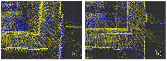 Top-down view on a LiDAR scan of a building. (a) shows erroneous and (b) the correct transformed point cloud data.